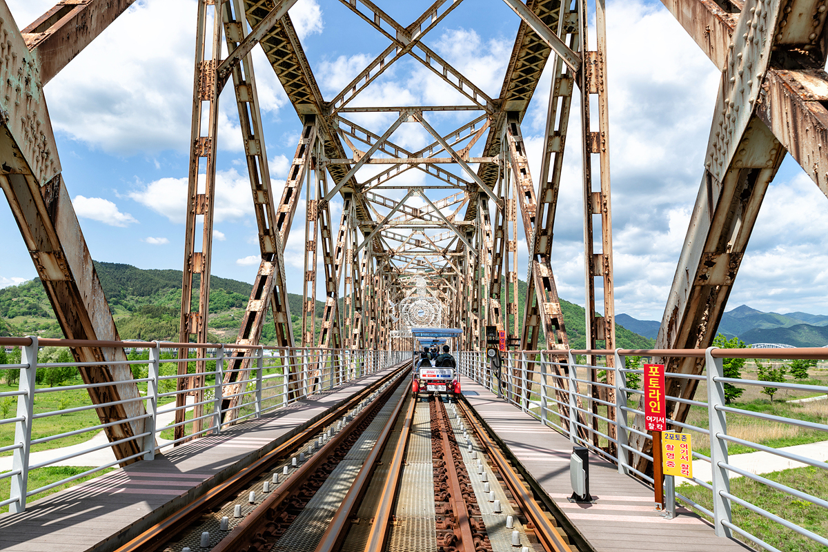 물론 수동으로 온 힘을 다해 페달을 밟아야 하는 수고로움은 있지만, 그래도 시원한 낙동강 강바람을 맞으며 철교 위를 달릴 때에는 기분이 꽤 좋아집니다. 또한 중간엔 차량이 통행하는 도로와 교차로 형태의 지점을 지나는 구간도 있어 관리자 분의 신호를 잘 보고 다녀야 하는 것도 특징입니다.