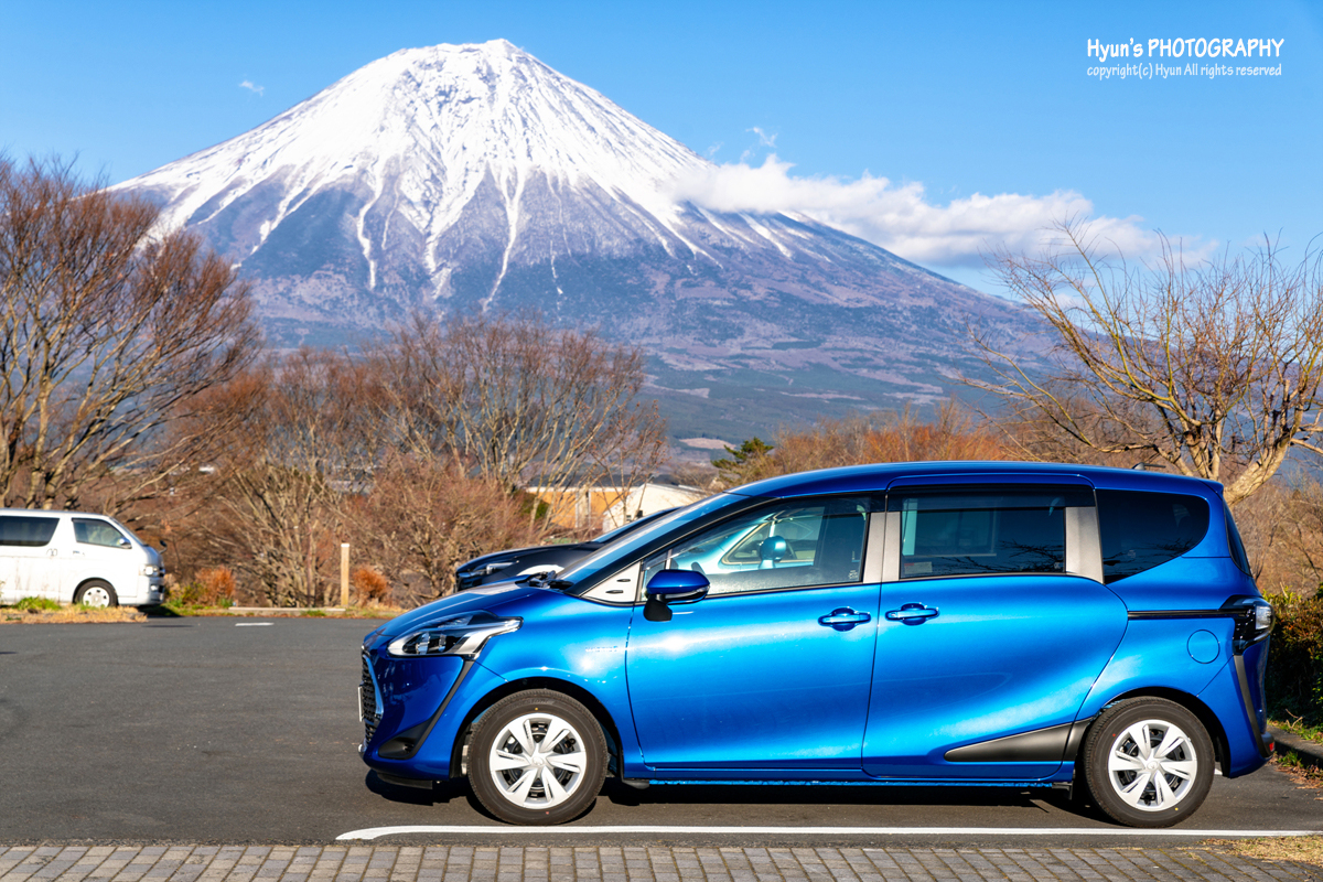 이번 시즈오카 여행 기간 동안 빌렸던 렌터카입니다. 토요타의 '시엔타'라는 차량인데요. 2+3+2 구조의 3열 시트로 되어 있고 성인 5명에 캐리어 4~5개 정도는 충분하더라고요. 국산차로 치면 오래전 단종된 카렌스 정도의 급이 아닐까 생각됩니다. 암튼, 시즈오카 시내에서 타누키 호수까지는 약 2시간 정도 걸리더라고요. 주차장에 도착하니 후지산이 한층 더 가깝고 크게 보입니다.