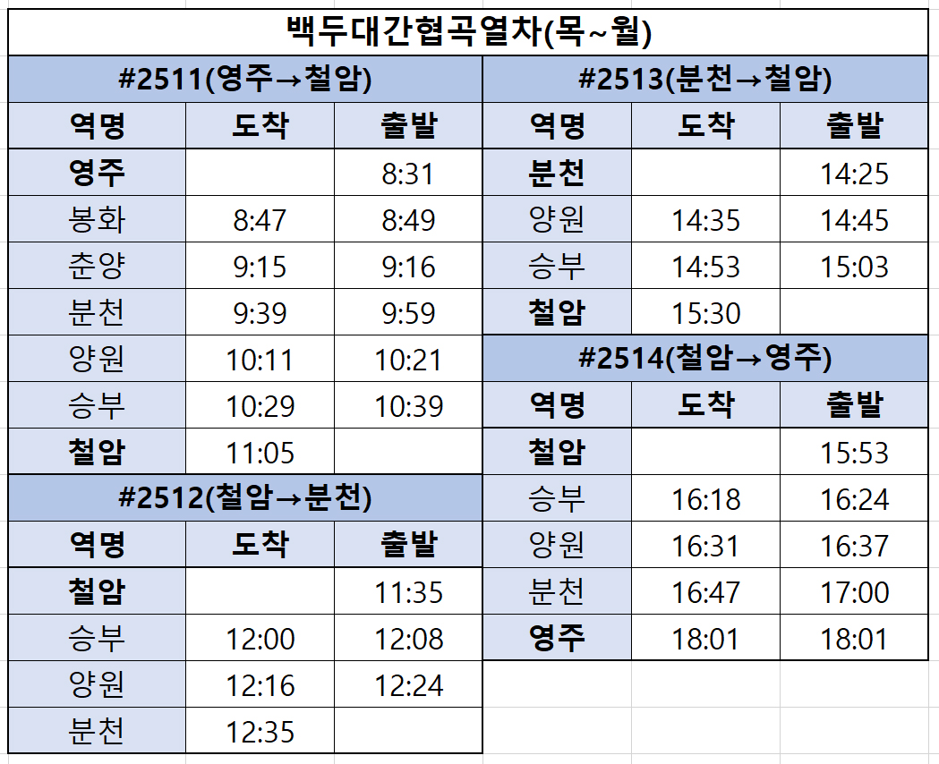 매주 화요일과 수요일은 운휴일이며, 목~월요일까지만 운행을 하고 있고요. 영주역에서는 오전 08:31 출발을 하여 철암역에 11:05 도착을 하게 됩니다. 영주역에서 타는 분들도 많지만, 분천역에서 탑승하는 분들도 의외로 많은 편이어서 분천역 출발시간이 궁금한 분들도 계실텐데, 분천역에서는 09:59 / 14:25 하루 두 편이 출발을 하고 있습니다.