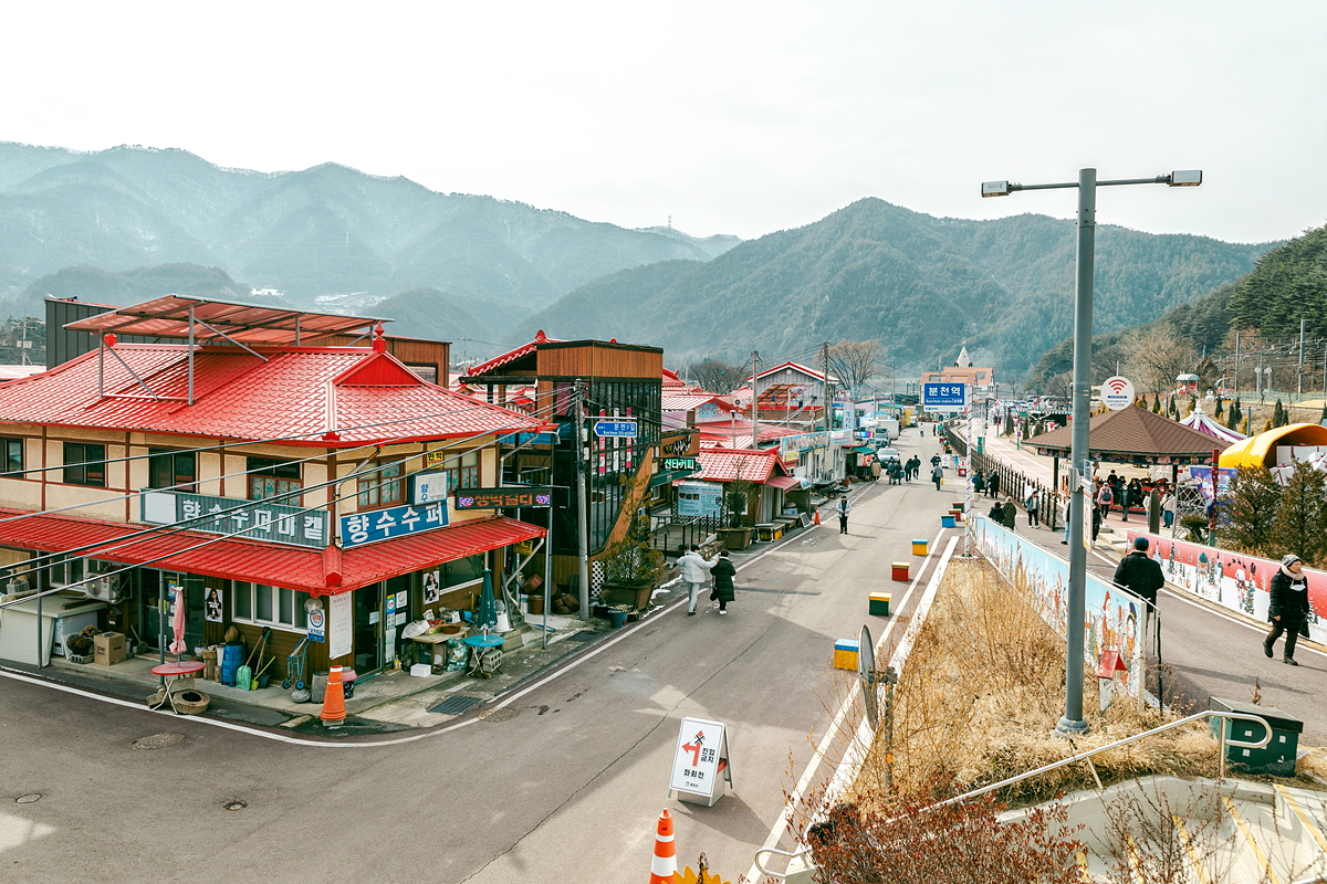 출발시간까지는 어느 정도 시간적인 여유가 있어 잠시 분천역 주변을 둘러보기로 했는데요. 오래전 분천역을 방문했을 때의 모습과 비교하면 꽤 많이 달라진 모습이었습니다. 무엇보다 마을 집이나 상가들 지붕이 대부분 빨간색으로 통일되어 있는 것이 눈에 띄더라고요. 분천역 주변이 산타마을이라는 별칭을 얻은 것이기도 하고, 또한 분천역이 실제로 스위스 체르마트역과 자매결연을 맺은 역이라 그런지 눈이 내렸을 때에는 스위스 분위기가 살짝 날 것 같다는 생각이 들기도 했습니다.
