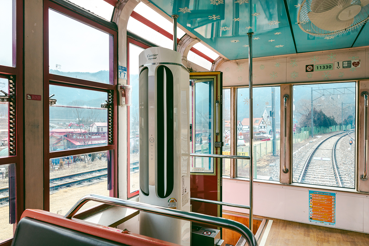 역시 일반열차가 아닌 관광열차로 만들어진 객차라 바깥 조망을 잘 할 수 있도록 창문들이 모두 시원시원하게 되어 있는 구조이고, 또한 한쪽은 좌석들이 모두 창가 방향으로 틀어져 있는 모습이기도 합니다. 1호차 제일 뒷쪽으로는 일반 에어컨이 설치되어 있기도 한데, 여름엔 에어컨 역할을 하기도 하고, 겨울엔 히터 역할을 하기도 하더군요. 또한 객차 중간쯤에는 레트로 감성을 돋게 하는 화목난로도 자리잡고 있습니다.