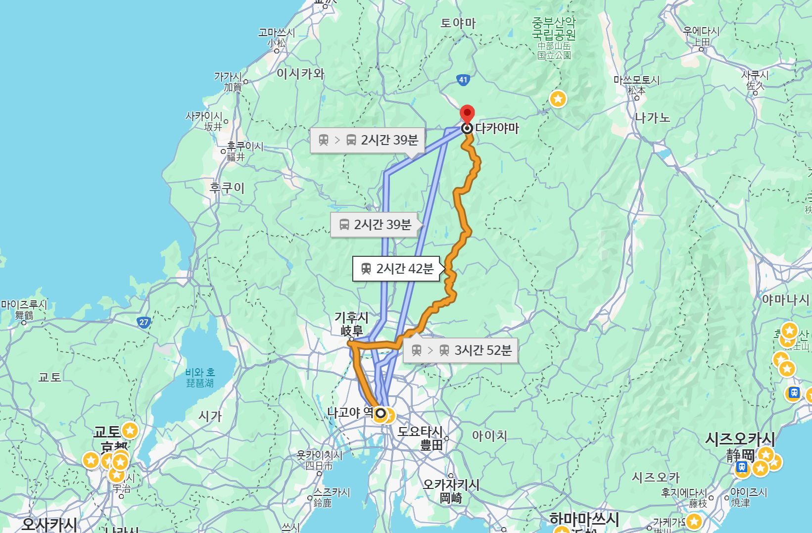 일본 소도시 다카야마는 기후현에 위치한 곳으로 워낙 소도시인 곳이라 이곳에 공항은 없고, 대신 나고야에서 기차나 버스를 타고 북쪽으로 약 3시간 정도 가야하는 곳입니다. JR 기차의 경우, 환승없이 나고야역에서 다카야마역까지 바로 가는 JR 히다 특급열차가 있고요. 버스 역시 나고야에서 다카야마까지 직통으로 운행하는 버스편이 있습니다.