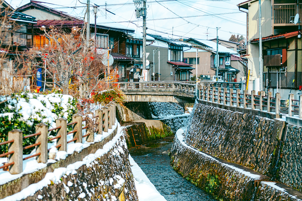 일단 첫날은 너무 늦게 도착을 해서 크게 한 것 없이 그냥 일찍 잠자리에 들었고, 다음날 아침 일어나보니 밤새 또 눈이 내렸는지 역 주변이 온통 하얀 세상으로 변한 모습이네요. 다카야마 시내에는 미야가와 강이 흐르고 있는데, 강의 폭은 짧지만, 강을 건너기 위한 짧은 다리가 꽤 많아 보였습니다.