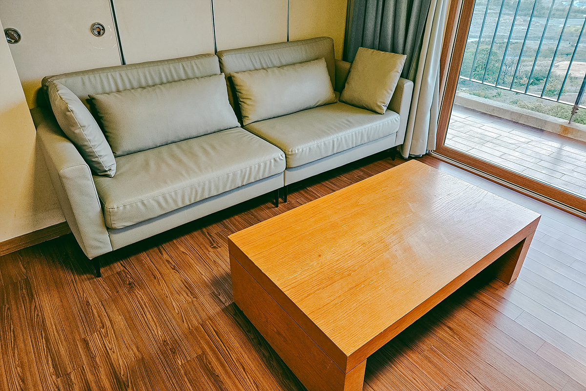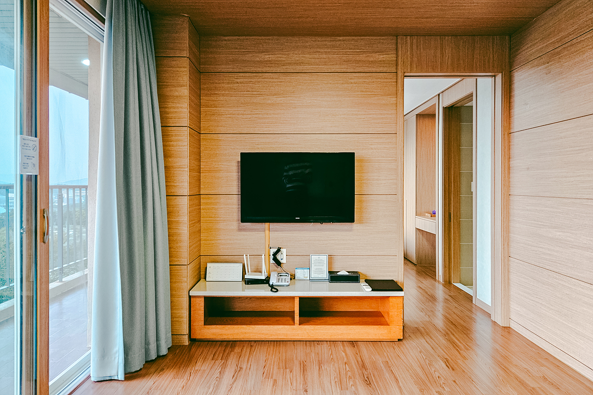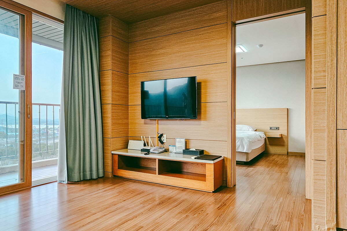 패밀리콘도로 운영되는 곳이다 보니 일반 호텔의 객실 구조와는 조금 다릅니다. 아무래도 4인 가족 기준으로 구성한 객실이다 보니 구조가 조금 더 넓은 편인데요. 그나마 제가 묵었던 36형 A타입은 패밀리콘도 내에서 가장 작은 객실이라고 해요. 암튼, 객실로 들어서니 넓은 거실과 함께 침대방 및 온돌방 등 방 2개와 욕실 2개가 있는 구조입니다. 다만, 리조트 자체가 조금 오래된 곳이어서 가구나 집기들은 조금 낡은 티가 나기는 했어요. 그래도 청소는 깔끔하게 잘 되어 있습니다.