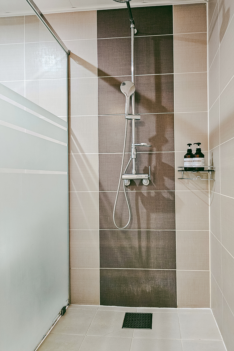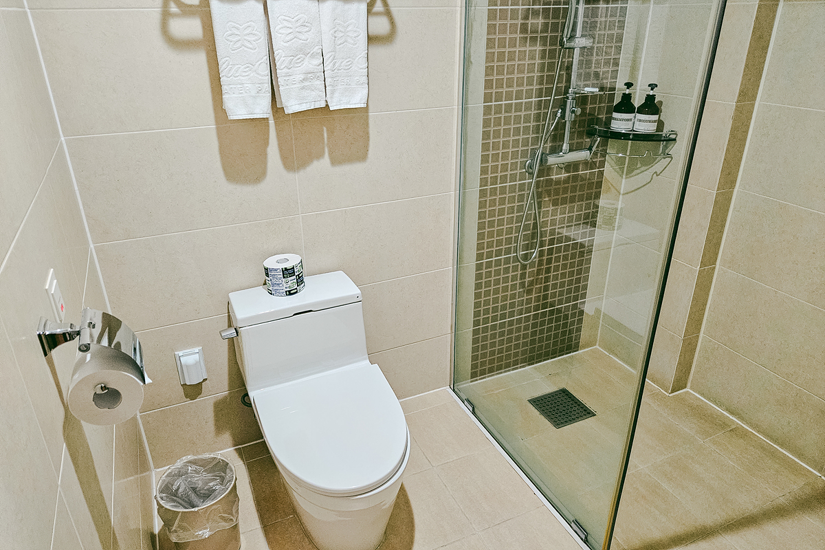 욕실 역시 2개가 있는 구조인데요. 하나는 침대방 안쪽에, 나머지 하나는 온돌방 맞은편에 있습니다. 각각 변기와 샤워공간이 따로 구분되어 있으며, 변기 비데는 침대방 쪽 욕실에만 설치되어 있더군요.