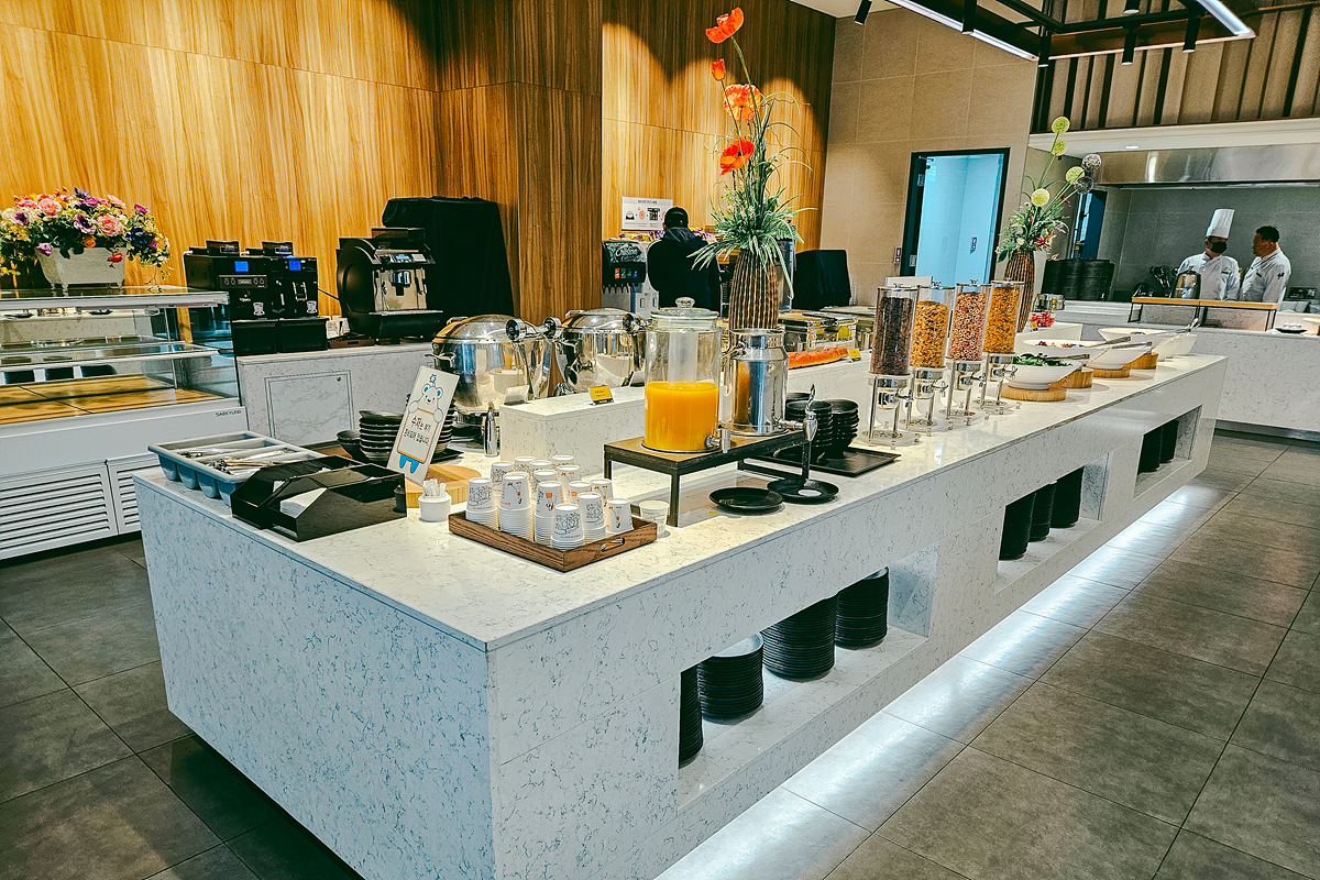 리조트 콘도 자체가 규모가 꽤 큰 편이라 조식을 먹을 수 있는 식당도 여러 곳이 있는데, 제가 먹었던 곳은 룩스타워 '더 브리즈'라는 곳이었어요. 한가지 아쉬웠던 점은 룩스타워가 패밀리콘도 건물 내에 있는 것이 아니라 별도의 건물에 위치해 있는데, 도보로는 생각보다 거리가 있는 편이더라고요. 차가 있으면 그냥 차를 타고 이동하는 것이 나을 정도였습니다. 도보로는 약 10분, 차로는 약 3~4분 정도 거리에 있어요.