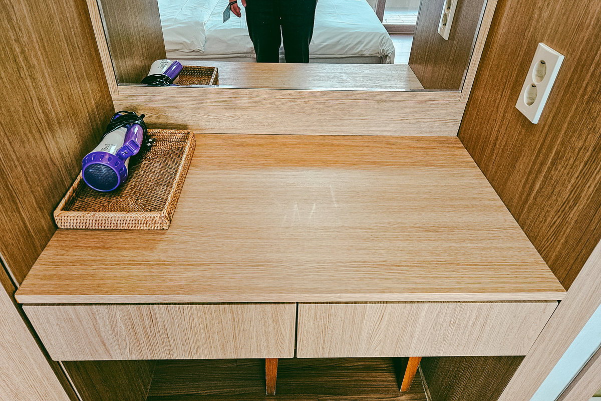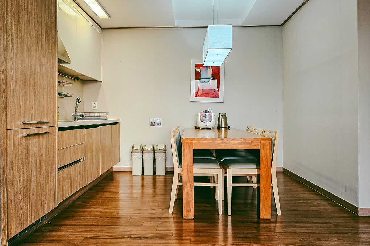 일반 호텔 객실과는 다르게 콘도로 운영되는 객실이다 보니 한쪽 주방엔 조리공간도 따로 준비되어 있습니다. 밥솥을 비롯해 식기들이 준비되어 있기도 하고요.
