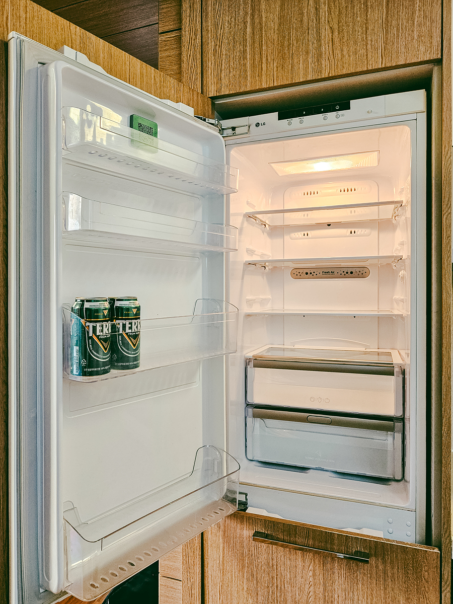 다만, 냉장고에는 아무것도 없어요. 일반 호텔에서 제공하는 생수조차 없으니 아까 위에서 소개한 편의점에서 생수나 마실 것들은 미리 구입하셔서 채워 놓는 것이 좋습니다. 저는 맥주 2캔을 채워 놓았어요.