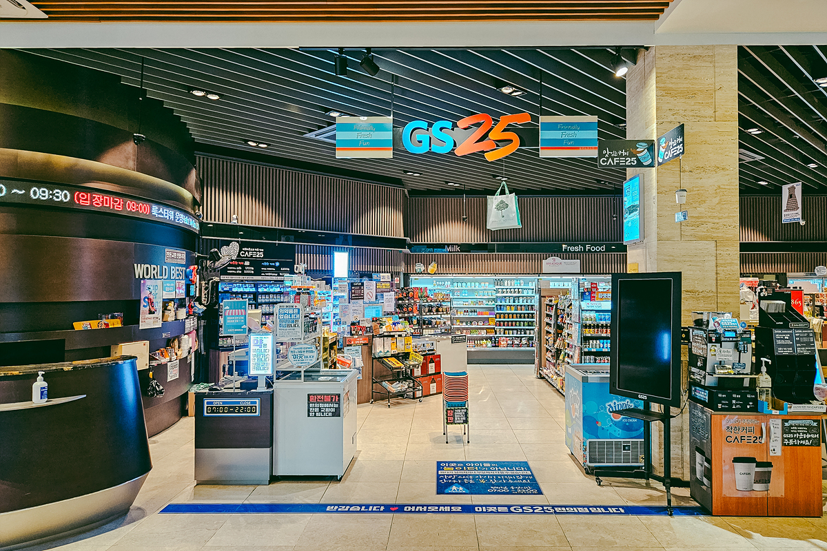 패밀리콘도 로비 입구로 들어서면 체크인을 위한 카운터가 있고요. 프론트 옆에는 GS25 편의점이 있어 숙소 바깥으로 나가지 않고도 1층 로비 편의점에서 필요한 물품들을 구입할 수 있는 것도 편리해 보였습니다. 단, 편의점 영업시간은 밤 10시까지로 정해져 있으니 필요한 것이 있으면 미리미리 구입해 놓는 것이 좋습니다.