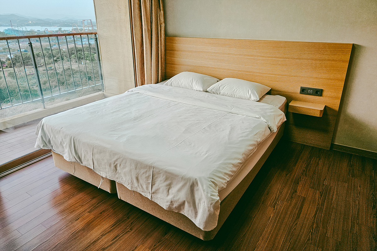 방은 침대방과 온돌방이 준비되어 있는데, 침대방은 더블침대가 놓여져 있습니다. 침대방은 공간이 조금 넓은데 반해 온돌방은 생각보다 조금 좁은 편이예요. 벽면엔 이불 수납장이 있고, 침대방과 온돌방의 테라스는 서로 연결되어 있습니다.