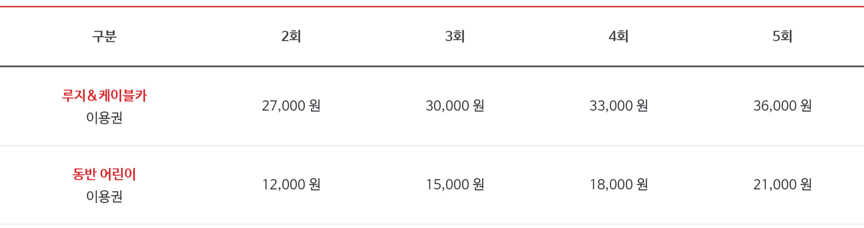 여수 바다루지는 일단 단독 탑승을 하기 위한 키 조건이 있는데요. 120cm 이상(36개월 이상)이어야 혼자 탑승이 가능하며, 85~120cm 이하의 키라면 반드시 보호자와 함께 탑승을 해야 합니다. 여수 바다루지 요금은 탑승횟수별로 차이가 있으며, 최소 2회부터 5회까지 탑승할 수 있습니다. 제일 저렴한 2회 요금은 27,000원이고요. 가장 많은 5회 탑승권은 36,000원입니다. 물론 루지를 타기 위한 케이블카 탑승 요금이 포함된 금액이예요.