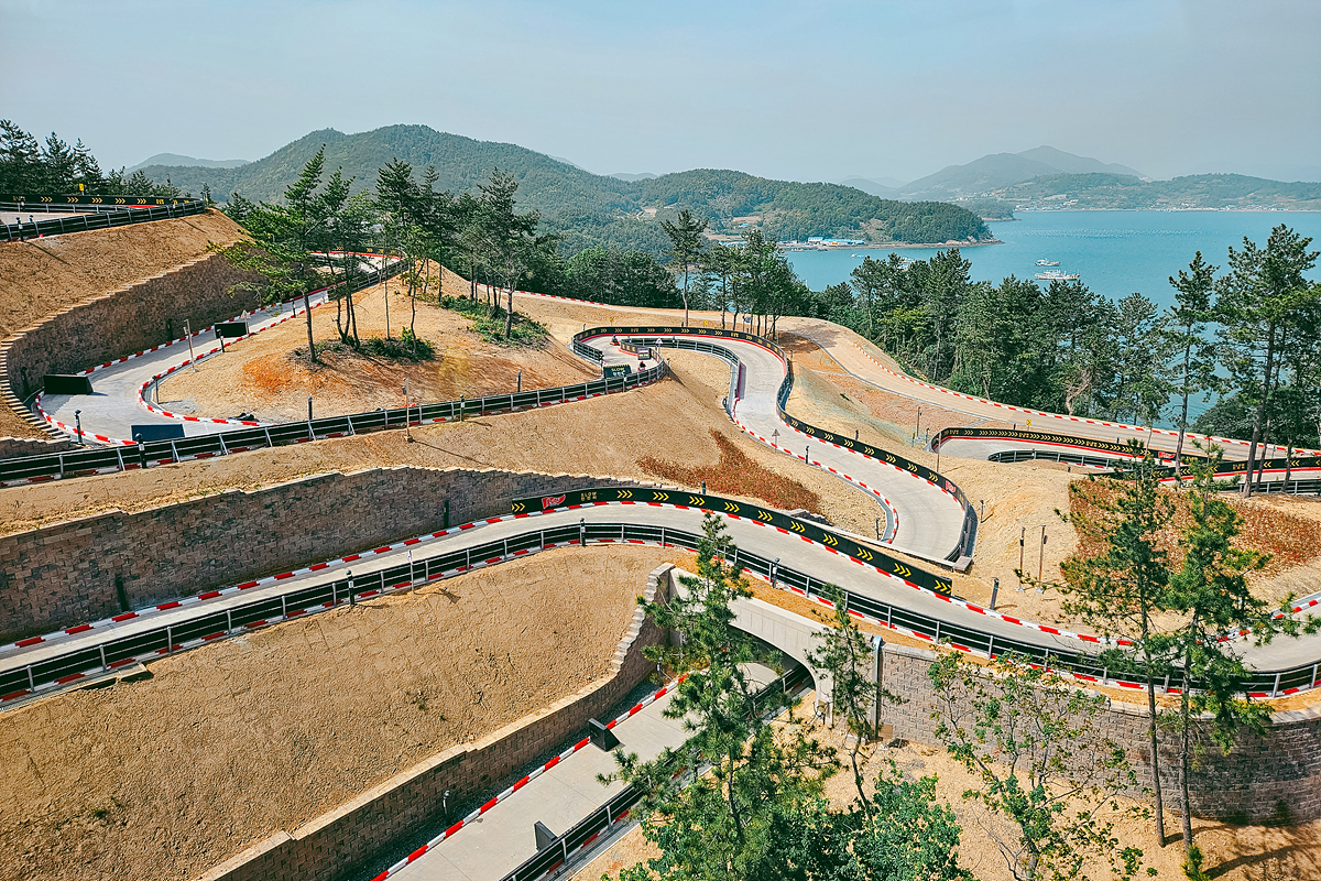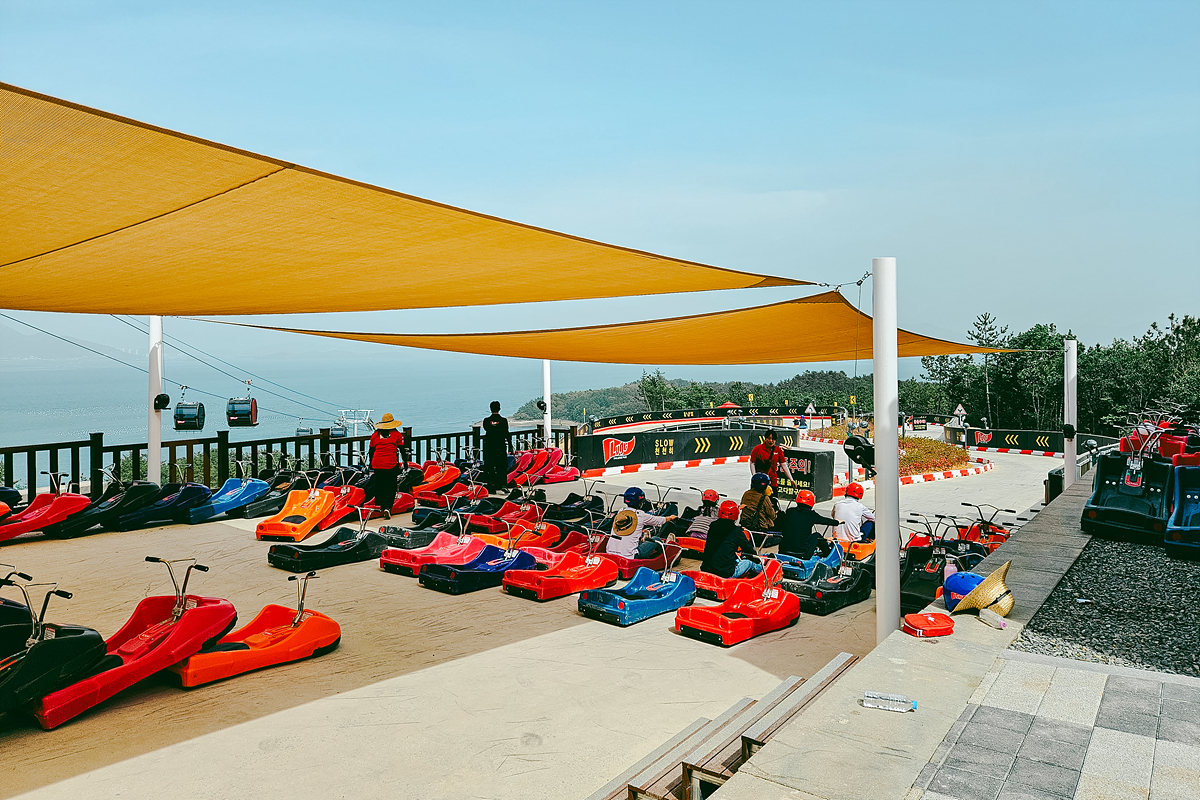 생각보다 루지 코스의 길이가 긴 편이라 케이블카를 타고도 한참이나 올라가야 하더라고요. 썰매 트랙의 길이가 길기도 하고, 또한 난이도 및 스릴에 따라 3~4코스 정도 다양한 코스로 준비가 되어 있다고 합니다. 무엇보다 탁 특인 여수 앞바다의 풍경을 바라보며 루지를 타고 내려올 수 있다는 것도 매력인 것 같더라고요.
