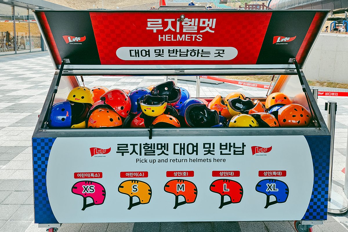 루지 체험을 할 때에는 안전을 위해 반드시 헬멧 착용을 해야 하니 케이블카 탑승 전 자신의 머리에 맞는 헬멧을 골라 착용 후 탑승해야 합니다.