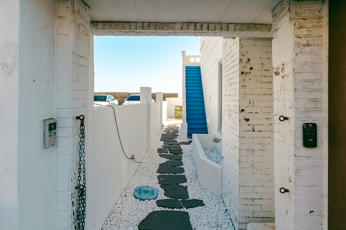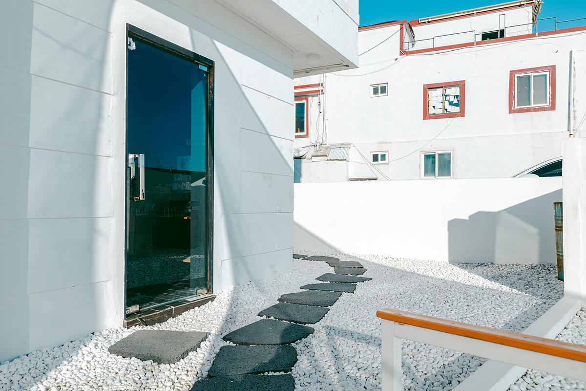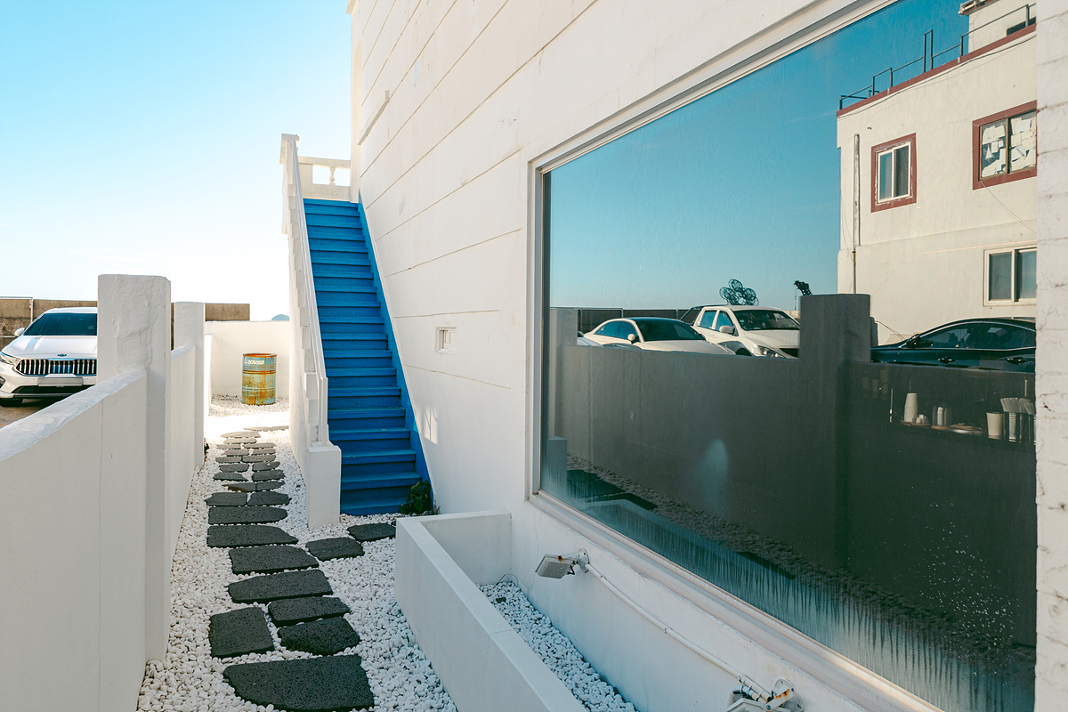 영도 오션뷰 카페인 비블랙으로 들어가는 입구는 두 곳에 마련되어 있는데요. 흰여울 문화마을 골목길 쪽에서도 들어갈 수 있고, 윗쪽의 도로가 쪽에서도 접근이 가능합니다. 차를 가지고 오는 분들은 도로가 쪽으로 진입하여 카페 옆 주차장에 주차 후 들어가시면 되요. 주차 후 외벽을 따라 좁은 길을 지나면 바로 야외테라스 및 루프탑 공간이 나오게 되는데요. 마치 그리스 산토리니와 비슷한 분위기의 하얀색과 파란색의 색감 조화가 꽤나 청량한 모습이었습니다.