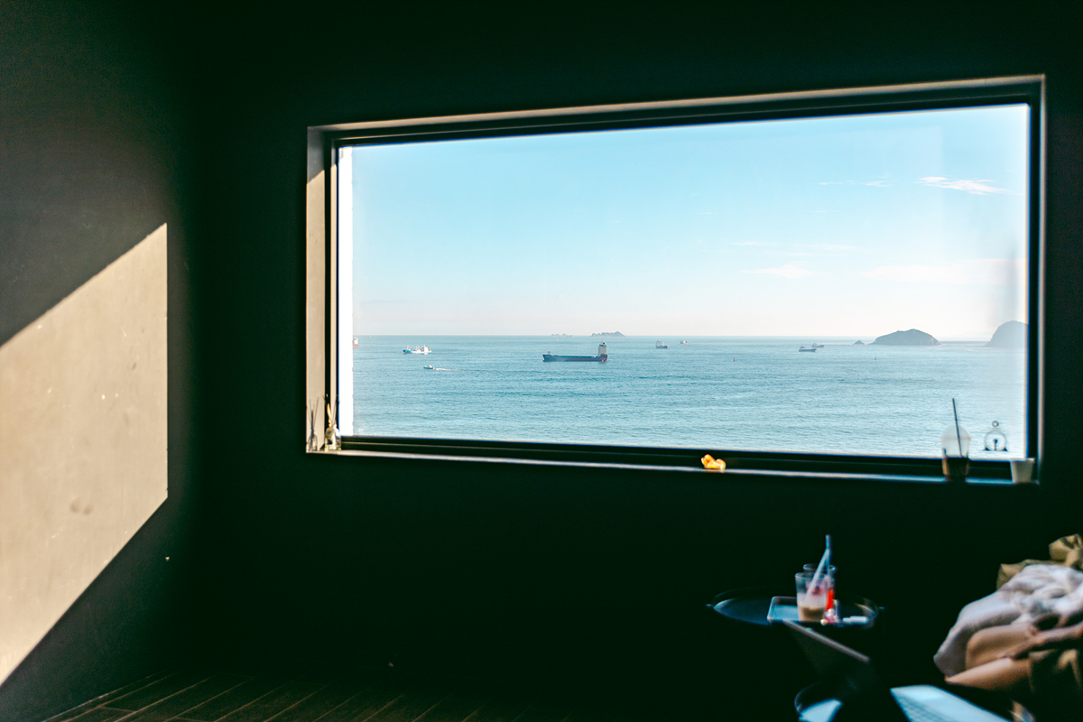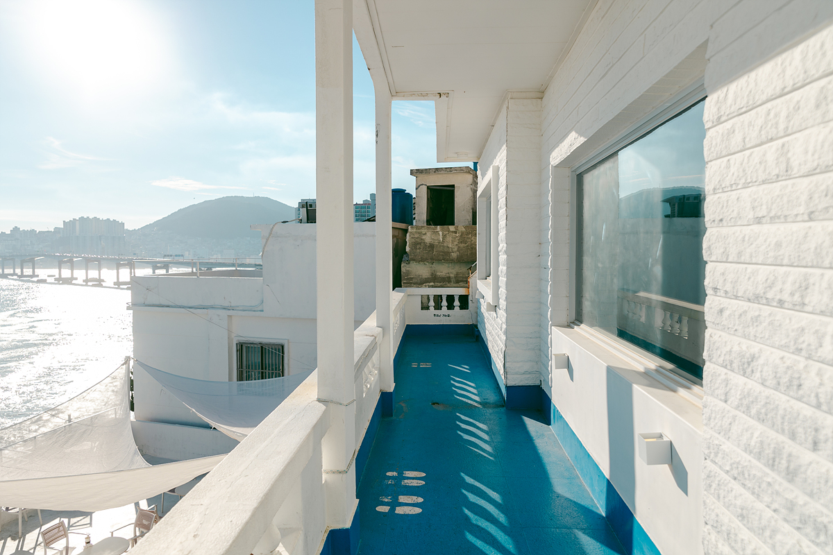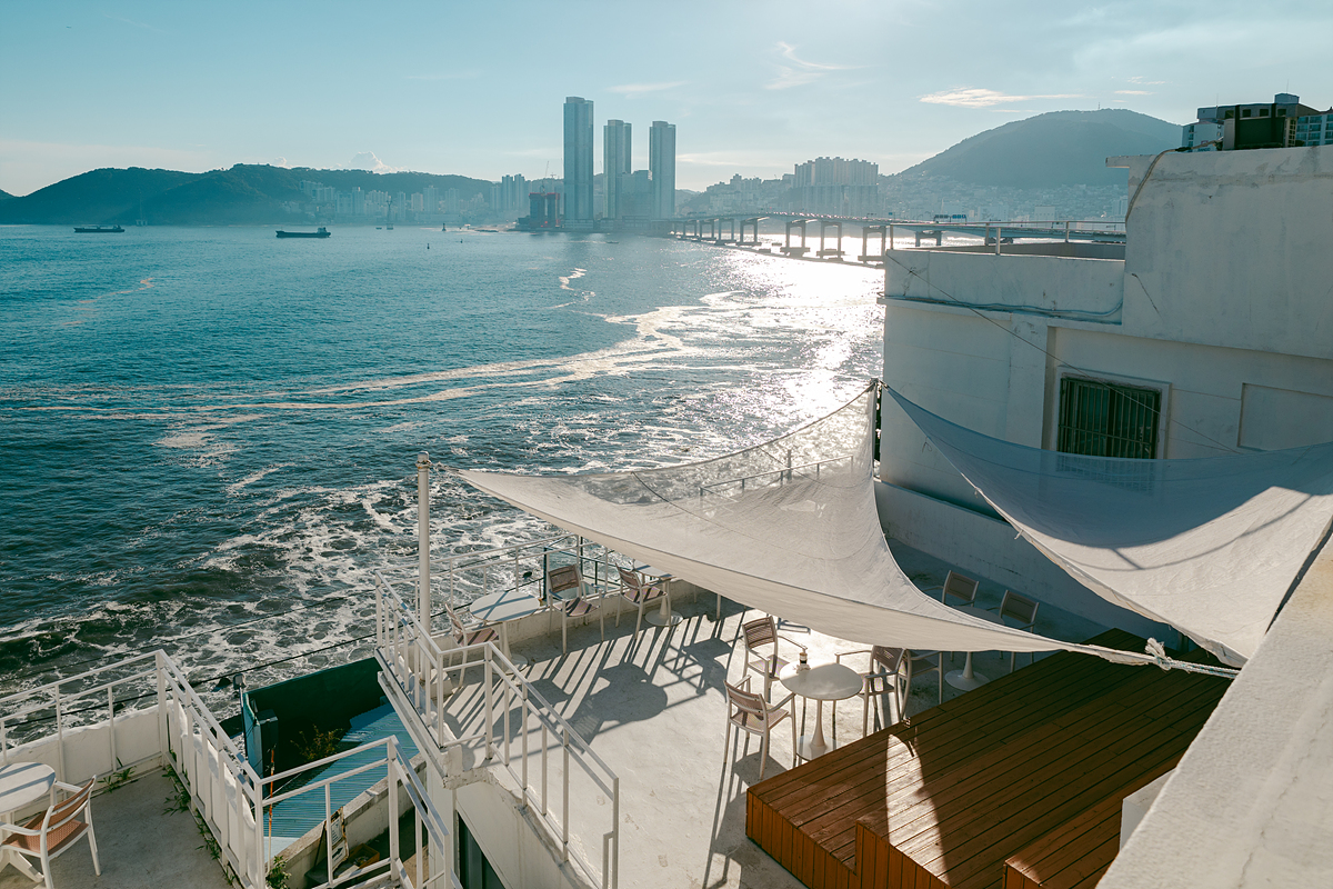 실내 공간에서 작은 문을 통해 바깥으로 나오면 바로 루프탑 공간이 나오게 되는데요. 시원한 부산 남항의 바다가 멋지게 펼쳐진 모습입니다. 햇빛이 강한 날엔 차양막이 설치되어 있어 차양막 그늘 아래에 자리를 잡는 것이 좋을거예요.