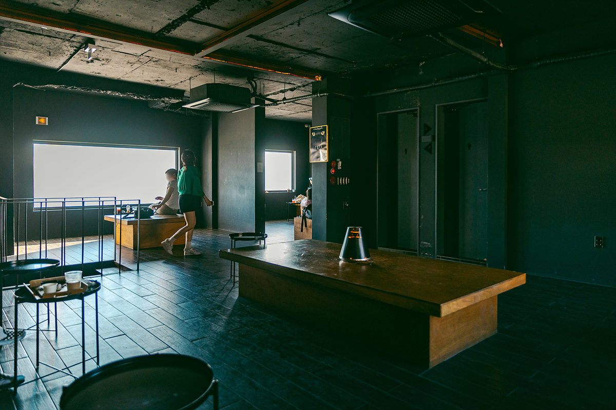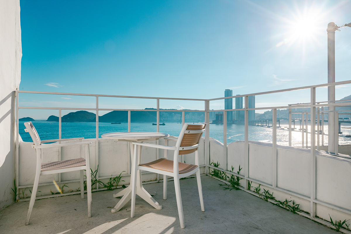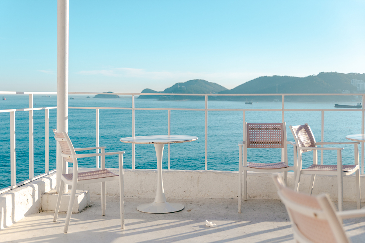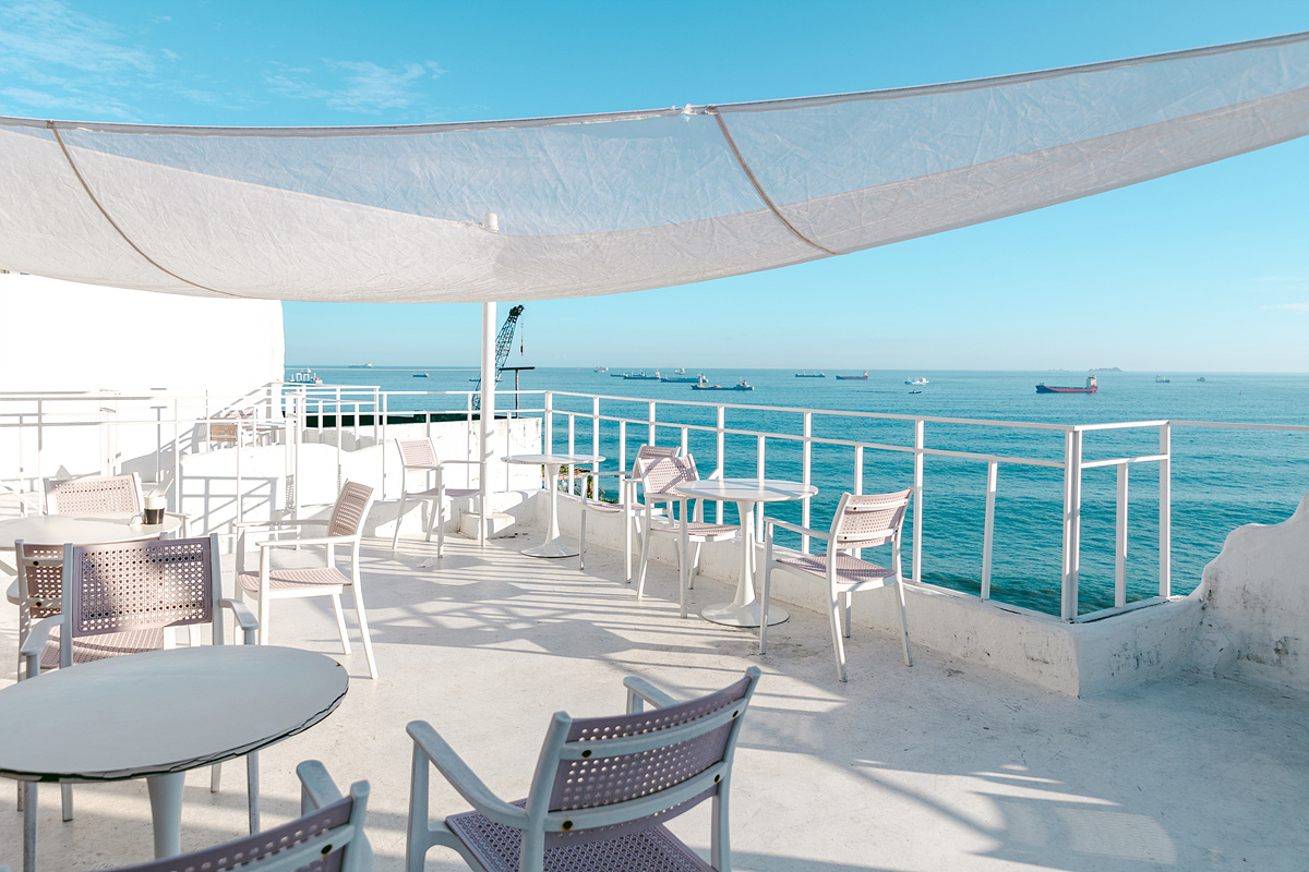 실내 공간에서 작은 문을 통해 바깥으로 나오면 바로 루프탑 공간이 나오게 되는데요. 시원한 부산 남항의 바다가 멋지게 펼쳐진 모습입니다. 햇빛이 강한 날엔 차양막이 설치되어 있어 차양막 그늘 아래에 자리를 잡는 것이 좋을거예요.