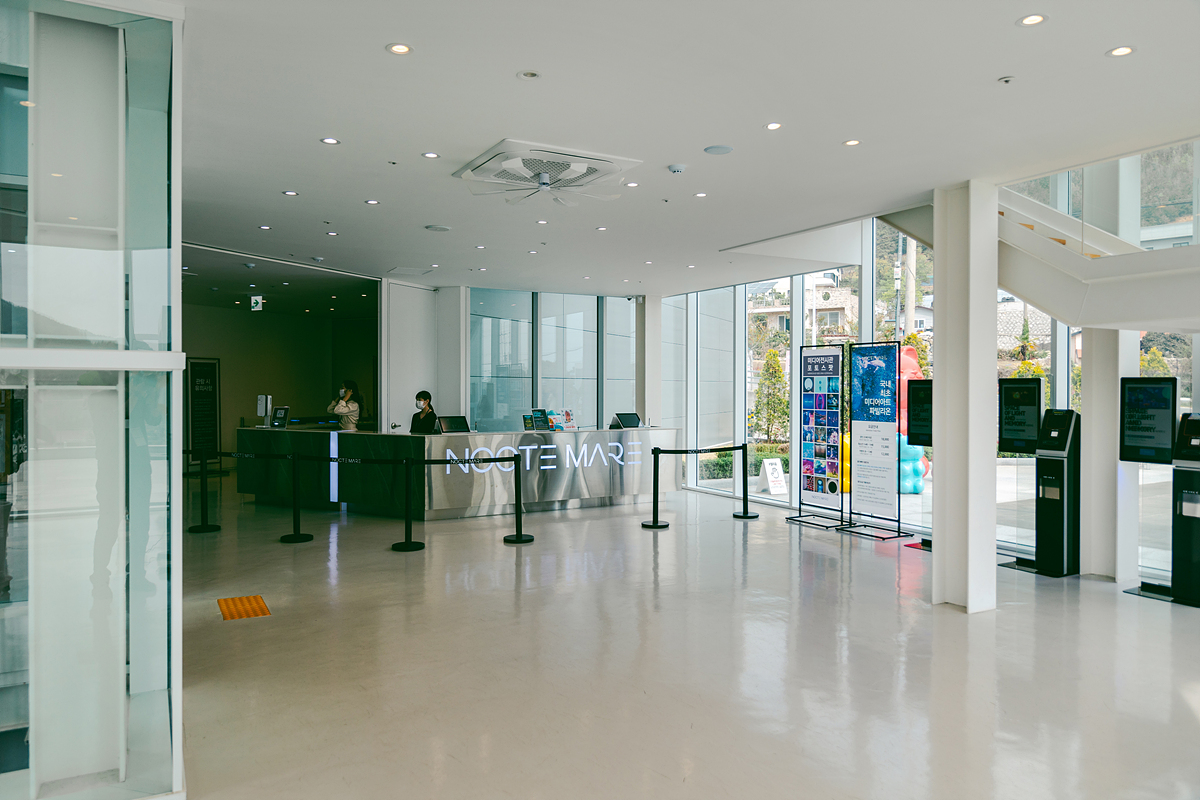 여수 녹테마레 미디어아트 전시관은 3층으로 구성되어 있습니다. 1층은 미디어 전시관, 2층은 아트갤러리, 3층은 BAO 루프탑 카페입니다. 1층 로비로 들어서면 입장권 무인발권기가 있으니 여기서 티켓 구입을 하시면 되요. 물론 데스크에서도 티켓 구입이 가능합니다. 티켓 구입 후 들어가기 전, 직원 분이 관람동선을 간단하게 설명을 해주는데, 그냥 1층부터 2층, 3층 순으로 둘러보면 되는 것 같았어요.