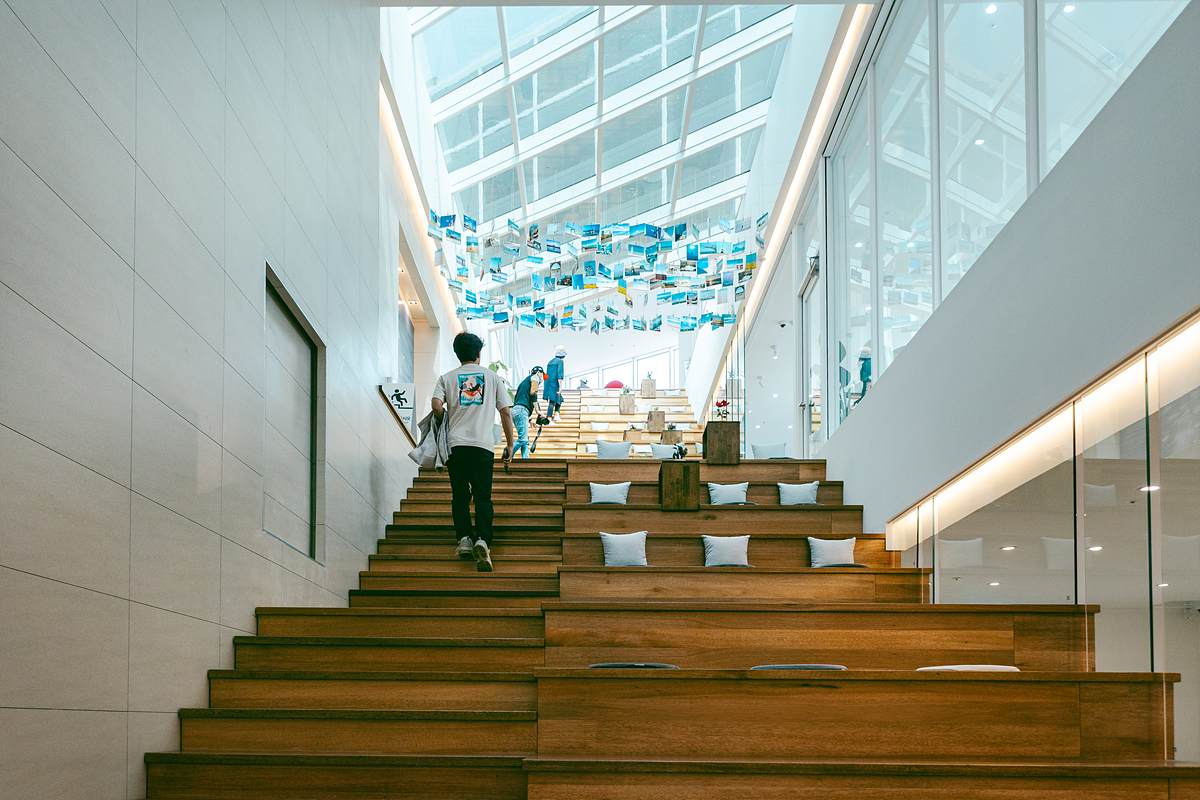1층 미디어아트 전시관을 둘러본 뒤 2층 아트갤러리로 올라가는 나무계단도 참 인상적이었습니다. 이 나무계단에 앉아서 사진을 찍어도 꽤 예쁠 것 같더군요. 아트갤러리라는 이름답게 곳곳에 다양한 작품들을 만나볼 수 있습니다.