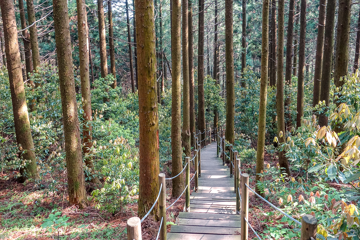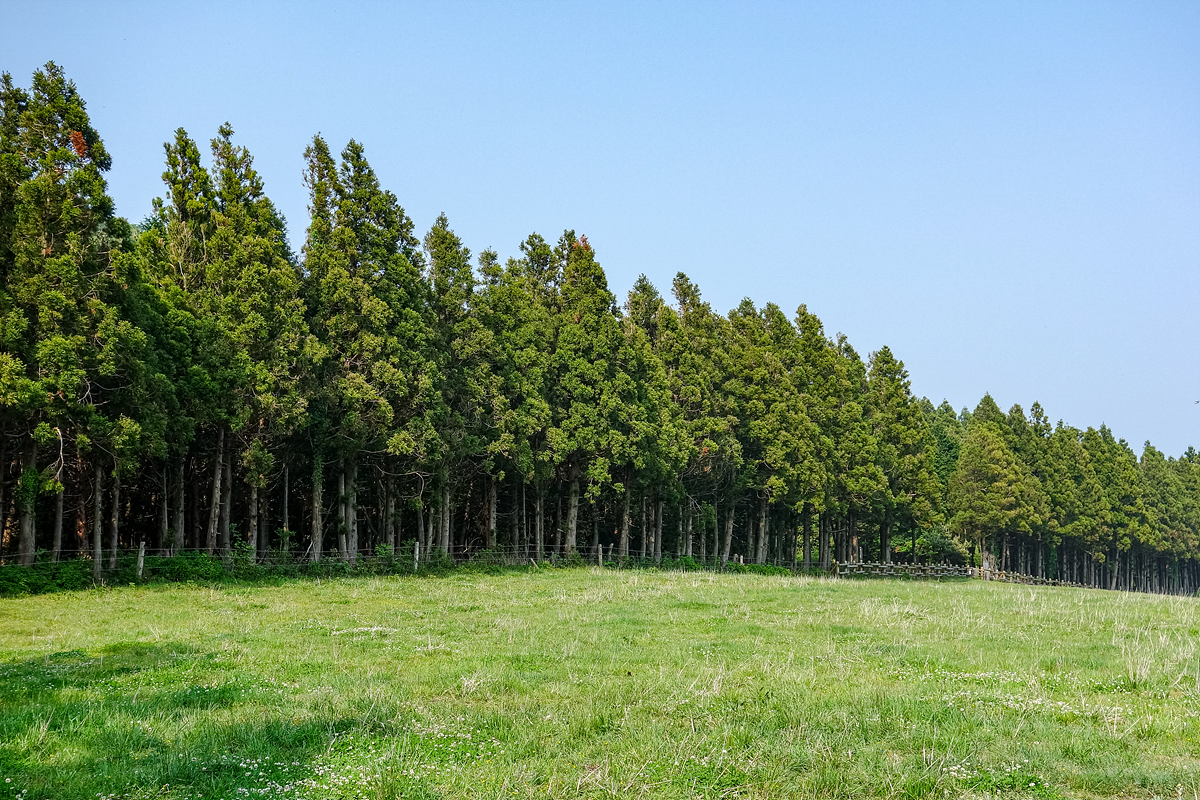 초원을 지나면 본격적으로 오름을 오르는 구간이 시작되는데, 이때부터는 데크길과 계단이 이어집니다. 경사가 점점 가팔라지며, 계단 구간이 많아 체력 소모가 있는 편이예요. 중간중간 벤치가 설치되어 있어 쉬어갈 수 있지만, 평소 운동을 자주 하지 않는 분이라면 난이도가 중급 이상으로 느껴질 수 있습니다. 최근에는 기존의 직선 코스 외에 완만한 신설 탐방로도 생겨, 오를 때와 내려올 때 코스를 다르게 선택해볼 수 있습니다. 특히 내려올 때는 울창한 삼나무 숲길을 걷게 되어, 상쾌한 공기와 함께 힐링감을 만끽할 수 있습니다.