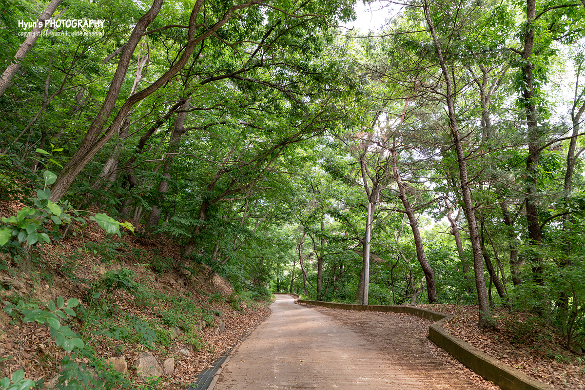 입구 안내판을 지나 오르막길을 천천히 걷다 보면, 울창한 숲길이 이어지게 되고요. 이 길은 봄이면 벚꽃이 흐드러지게 피는 벚꽃길로도 유명하고, 초여름에는 싱그러운 초록 숲이 펼쳐져 걷기만 해도 기분이 상쾌해집니다.