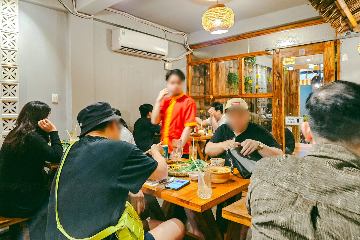 드디어 나온 반쎄오는 생각보다 크고 푸짐했습니다. 반으로 잘라 먹기 좋게 직원이 잘라주며, 곁들임으로는 각종 쌈채소와 허브, 그리고 소스가 함께 제공됩니다. 채소에 싸서 소스에 찍어 먹는 방식인데, 전체적으로 한국인 입맛에 매우 잘 맞는 편이었습니다. 특히 맥주와의 궁합이 훌륭해서, 혼자서도 충분히 만족스러운 식사였어요. 총 비용은 약 20만동, 한화로 1만 원 초반대 정도. 베트남 현지 물가 기준으로는 조금 높은 편이지만, 실내가 깔끔하고 음식 퀄리티를 생각하면 납득 가능한 가격입니다.