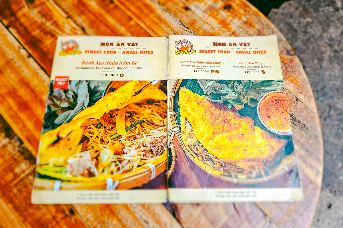 메뉴판을 받자마자 눈에 띈 건 단연 반쎄오. 베트남식 부침개 혹은 오믈렛처럼 보이는 이 음식은 바삭한 계란 부침 안에 고기, 해산물, 채소 등이 가득 들어간 형태인데요. 저는 Must Try로 표시되어 있던 소고기와 버섯 반쎄오(159,000동)를 주문했습니다. 그리고 곁들일 맥주로는 시원한 사이공 스페셜을 선택했지요. 맥주는 캔 그대로 얼음컵과 함께 나오는데, 무더운 날씨 속에서 꽤 괜찮은 조합이었습니다.