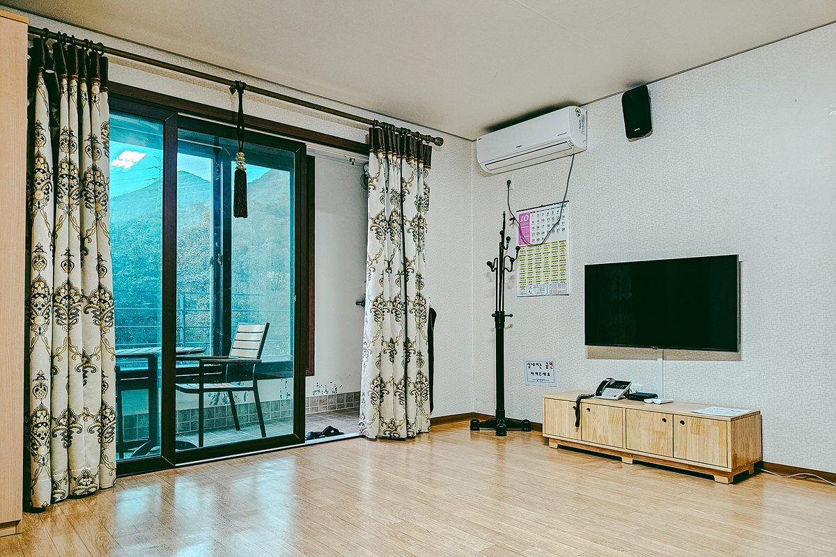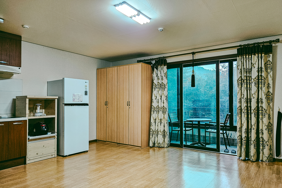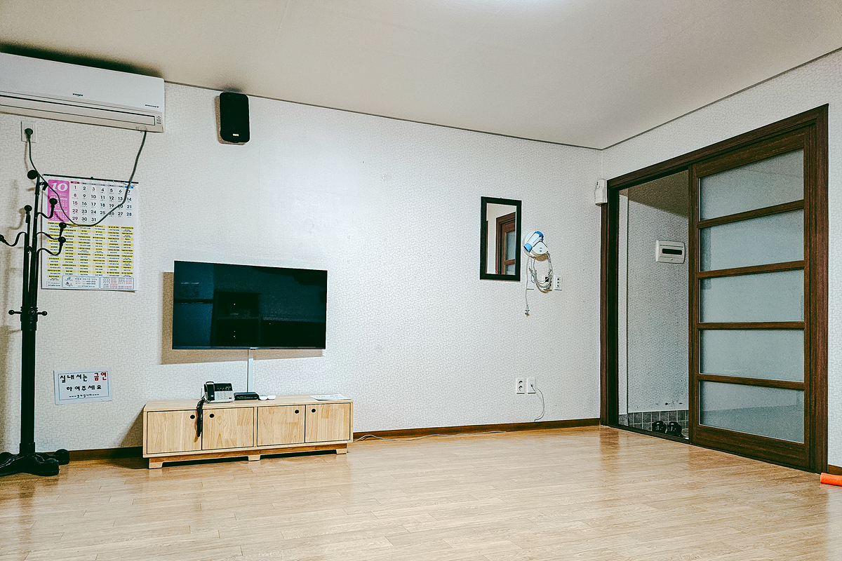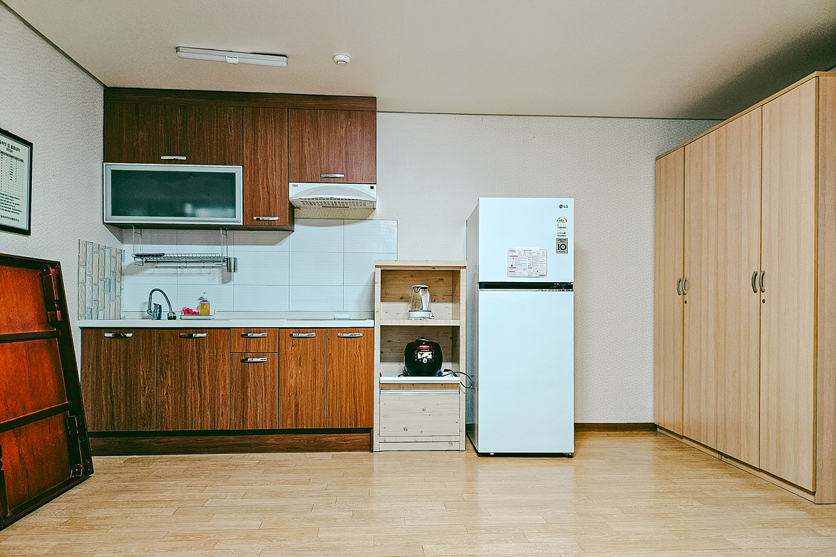객실 내부는 4인 기준 방으로, 생각보다 넓고 쾌적한 편이었습니다. 이불장 안에는 넉넉한 침구가 준비되어 있고, 냉장고와 TV, 싱크대, 밥솥 등 기본적인 가전과 조리도구가 갖춰져 있습니다.