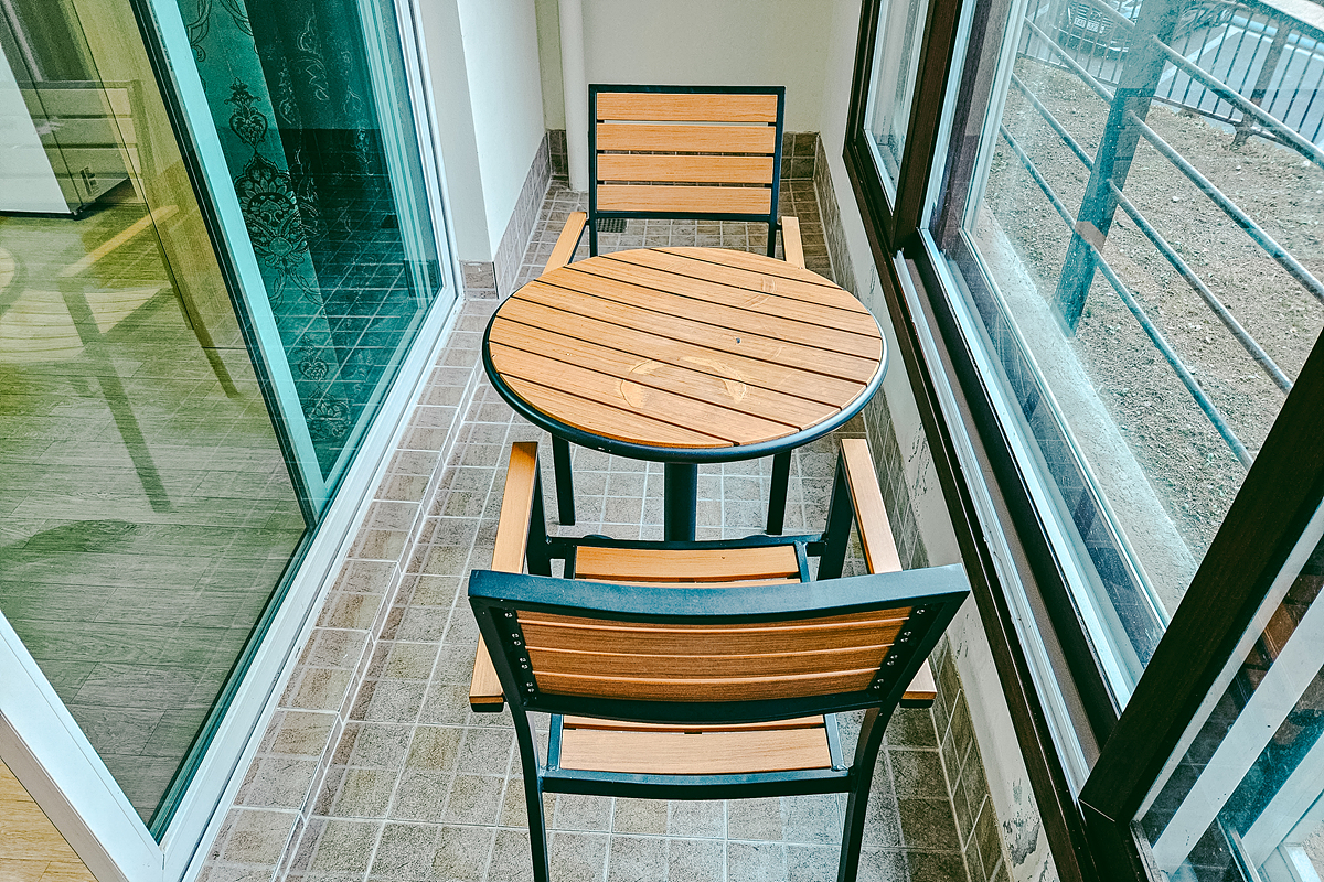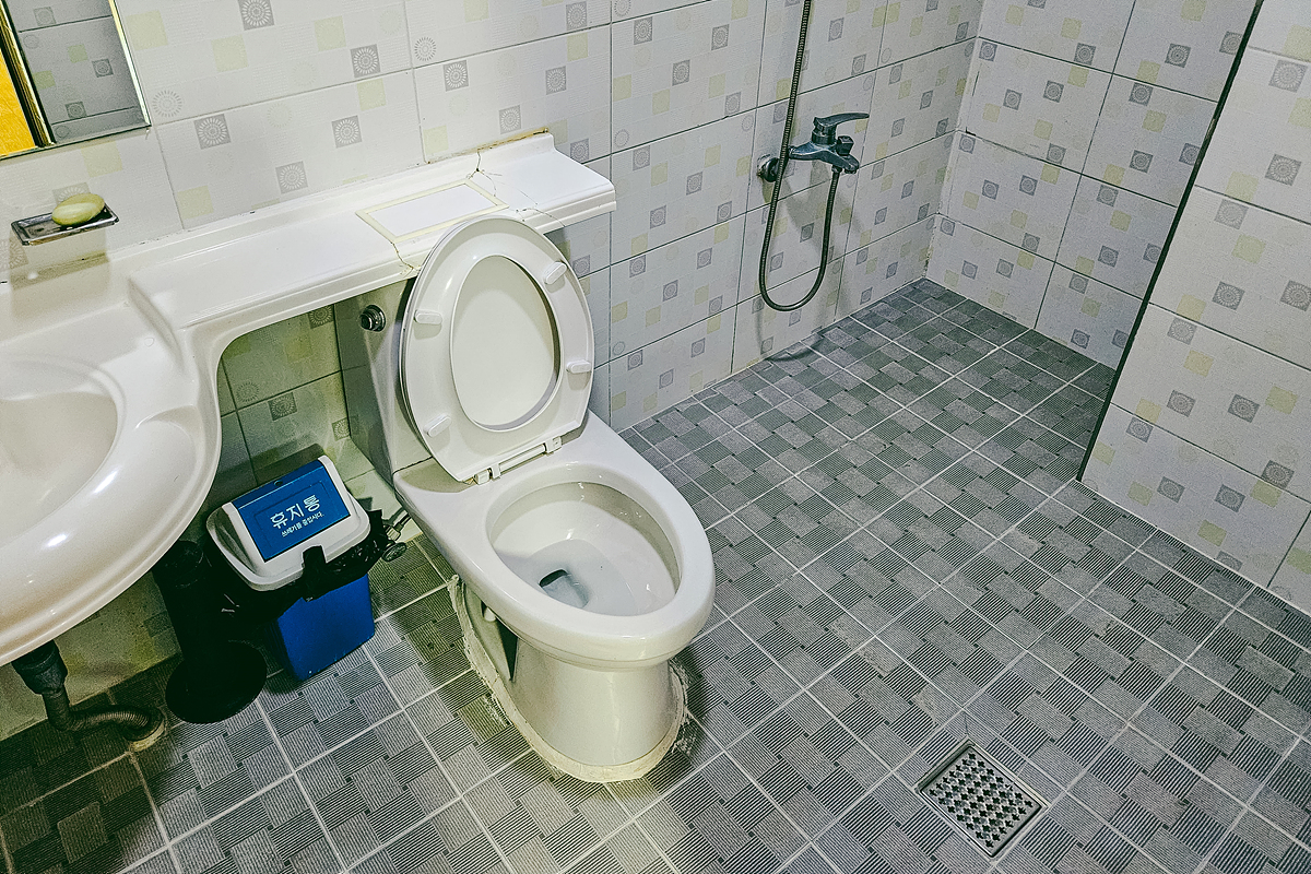 테라스에는 작은 테이블과 의자도 마련되어 있어 가볍게 차 한 잔 즐기기에도 좋았습니다. 욕실은 다소 오래된 느낌이 있지만, 청소 상태가 깔끔해 불편함은 전혀 없었습니다. 다만, 대부분의 휴양림과 마찬가지로 수건과 세면도구는 제공되지 않으니 반드시 개인이 준비해야 합니다.