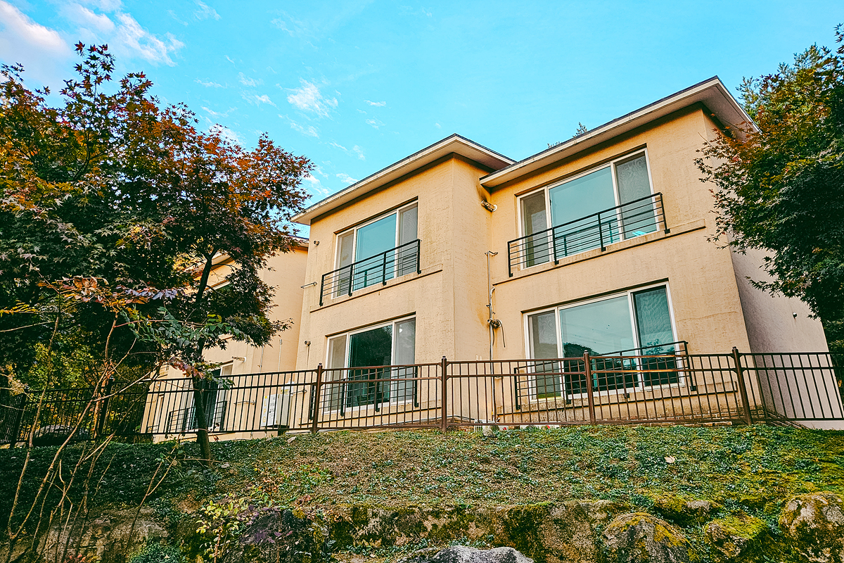 복합동은 일반 펜션처럼 2층 구조의 건물로 되어 있으며, 외관은 깔끔하고 단정한 인상을 줍니다. 건물 뒤편에는 야외 바베큐장이 마련되어 있어 저녁에는 가족이나 친구들과 함께 고기를 구워 먹기 좋습니다.